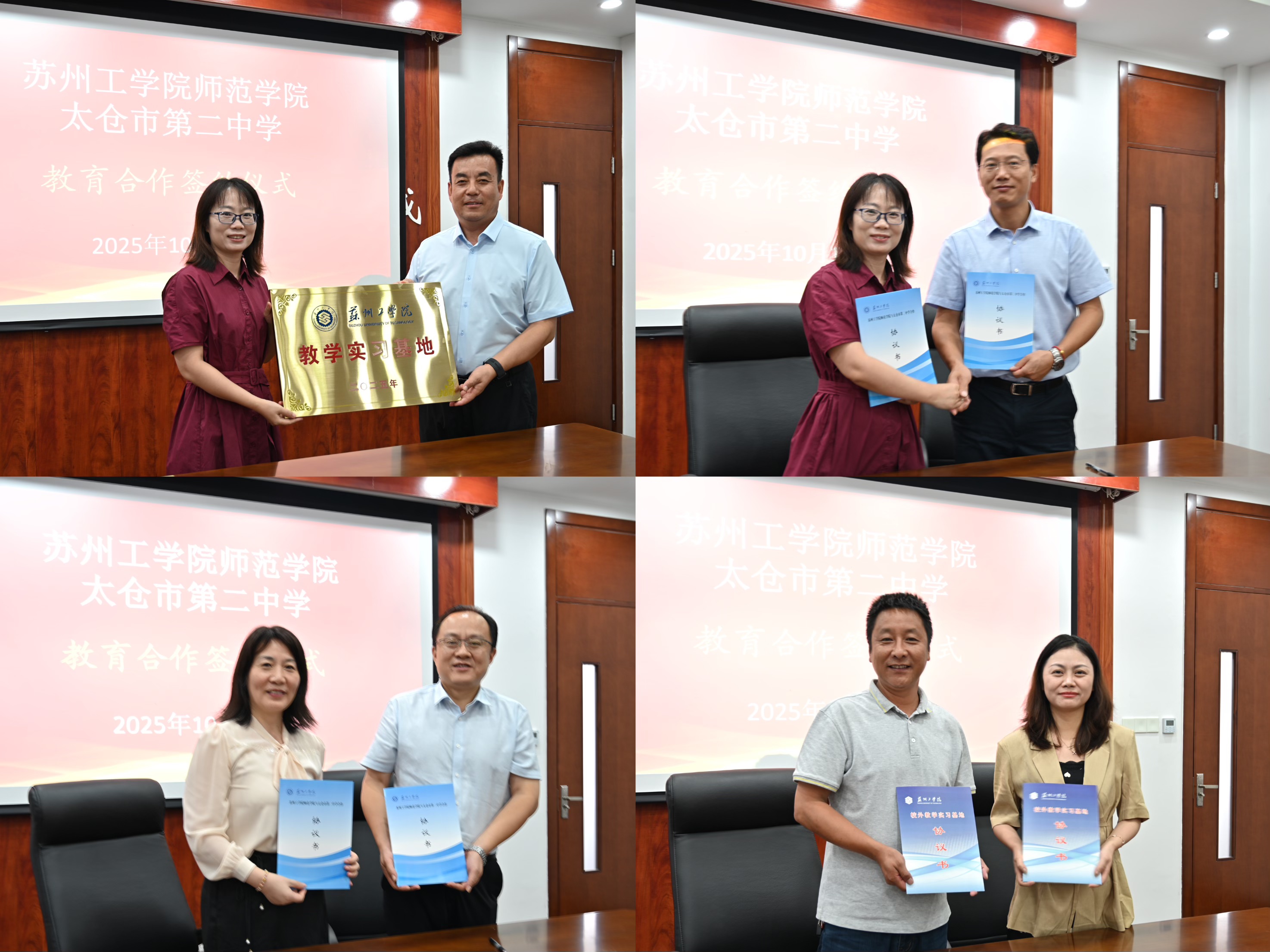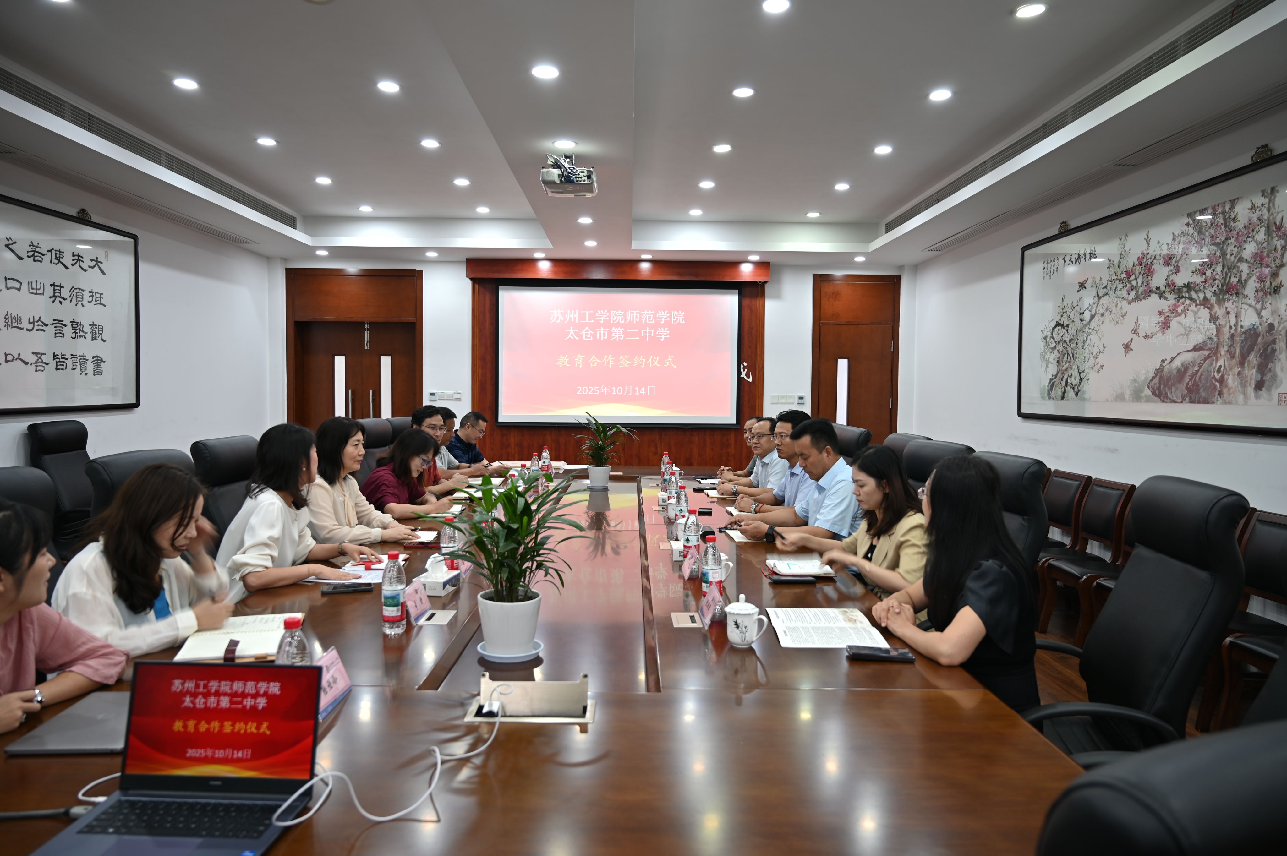 2025年10月14日下午,苏州工学院师范学院一行六人,在院党委书记徐正兴、院长闫祯的带领下,到太仓市第二中学推动校地教育合作事宜,并顺利签署教育合作协议。太仓市第二中学书记、校长许秋红率学校领导班子及部分中层干部参与了签约仪式。